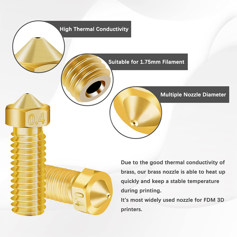 E3D Volcano Brass Extruder Nozzles 0.4mm M6 Thread for 3D Printer - Ideal for 1.75mm ABS/ PLA FilamentDescription:Transform your 3D printing experience with our pack of E3D Volcano Brass Extruder Nozzles. These nozzles are precision engineered with a 0.4mm aperture and M6 thread, designed specifically to handle 1.75mm ABS and PLA filaments.Our E3D Volcano nozzles are designed to optimise your printing speed and quality. Whether you're printing detailed prototypes, creating large scale models, or producing intricate designs, these nozzles enable you to print faster, stronger, and bigger. Capable of high layer heights and extruding a greater amount of plastic per second, these nozzles will drastically reduce your printing times while maintaining the print quality.These robust brass nozzles are made with the highest quality standards. Brass, as a material, is known for its excellent thermal conductivity which ensures optimal heat distribution during the printing process. This translates into a smoother, more precise extrusion for every single print.Compatible with a broad range of 3D printers, these nozzles work excellently with popular models such as the Anycubic Vyper, Anycubic Kobra Max and any other 3D printers that use an E3D hotend.The package includes E3D Volcano Nozzles with a 0.4mm opening. This multipack ensures you'll have plenty of replacements on hand, offering the flexibility to keep your 3D printing projects running smoothly.Invest in these E3D Volcano Brass Extruder Nozzles today, and elevate the efficiency and quality of your 3D printing experience.Note: Please ensure to check your 3D printer specifications for compatibility before purchasing.
